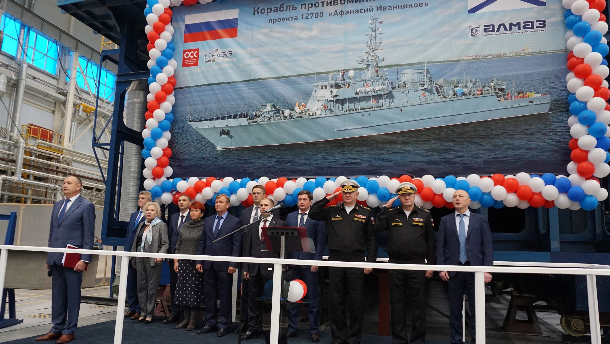 В праздничном мероприятии принял участие главнокомандующий ВМФ РФ адмирал Николай Евменов, генеральный директор АО «СНСЗ» Владимир Середохо, первый заместитель генерального директора АО «ОСК» Андрей Бузинов, председатель Комитета по промышленной политике, инновациям и торговле Санкт-Петербурга Кирилл Соловейчик, депутат Государственной Думы РФ Михаил Романов, депутат Законодательного Собрания Санкт-Петербурга Елена Киселева, глава администрации Колпинского района Анатолий Повелий, главный инженер Центрального морского конструкторского бюро «Алмаз» Константин Голубев, а также работники и ветераны АО «СНСЗ».