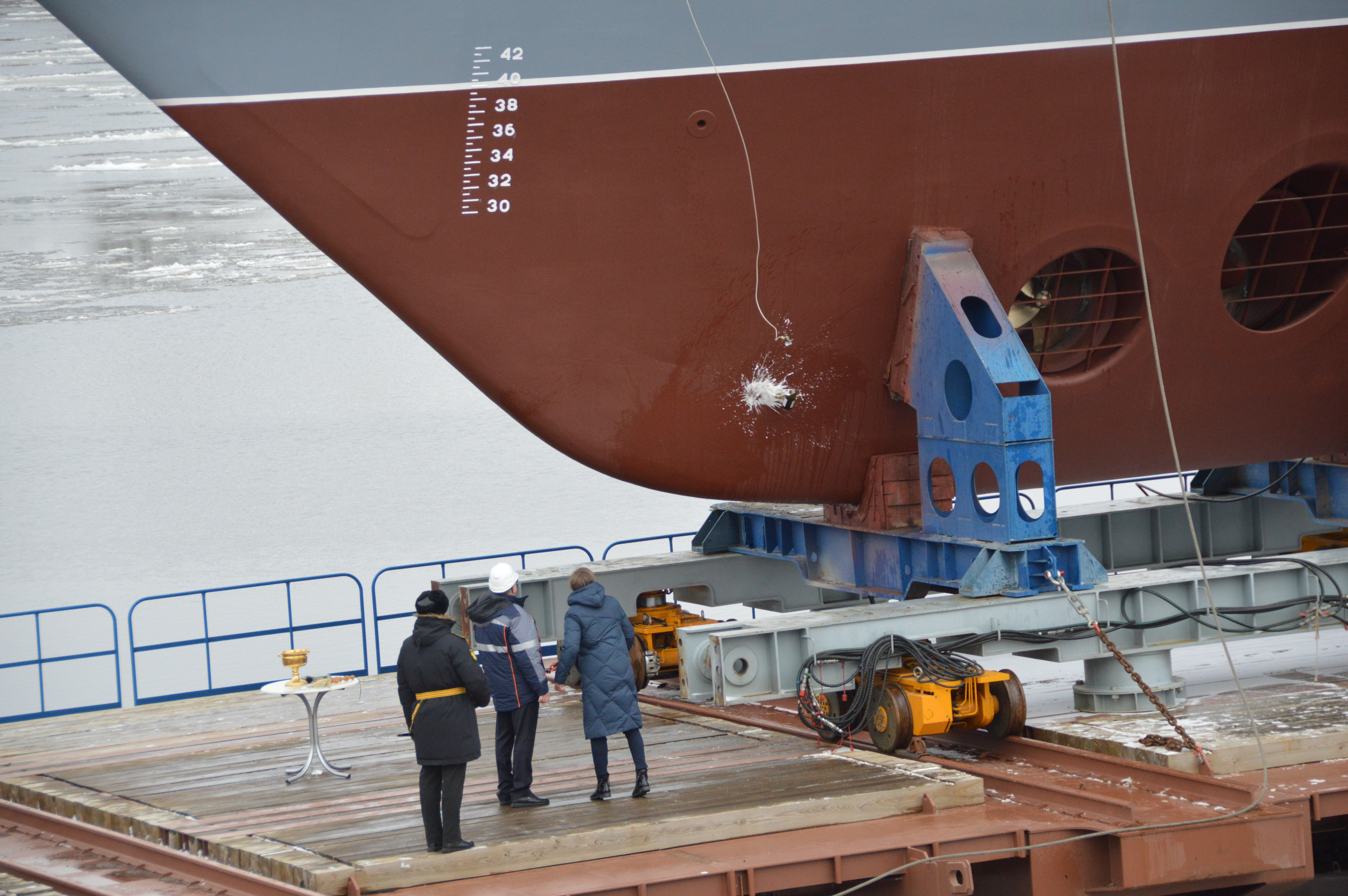 В праздничном мероприятии приняли участие работники и ветераны АО «СНСЗ», представители Военно-Морского флота, Центрального морского конструкторского бюро «Алмаз» и Администрации Санкт-Петербурга. Право разбить бутылку шампанского о борт тральщика предоставили Полине Баляевой - внучатой племяннице Героя Советского Союза Якова Илларионовича Баляева, чьё имя носит новейший корабль противоминной обороны.